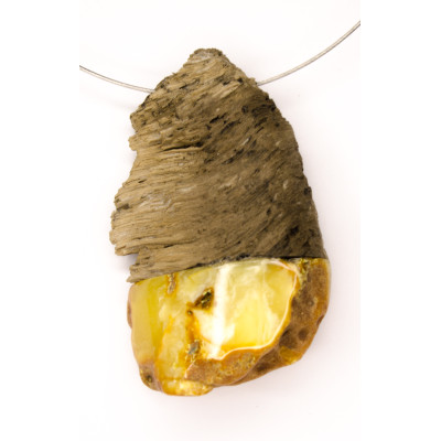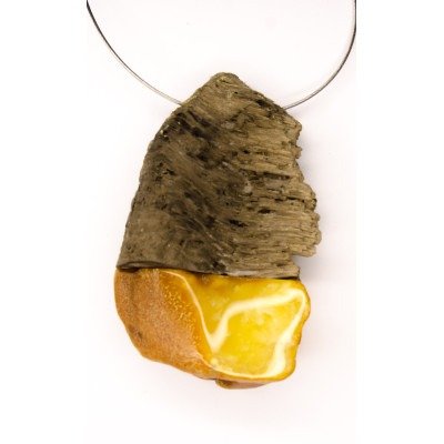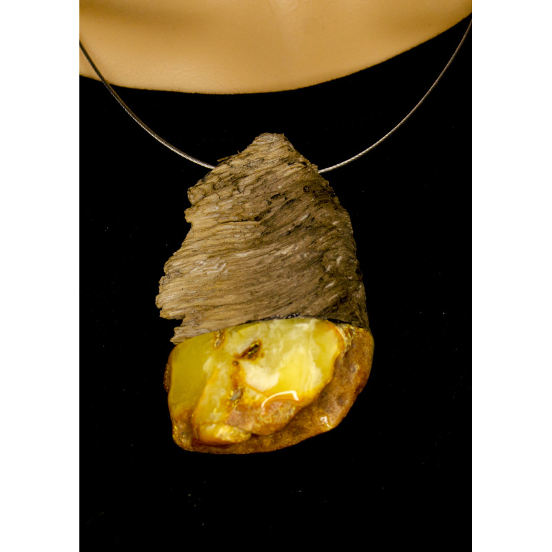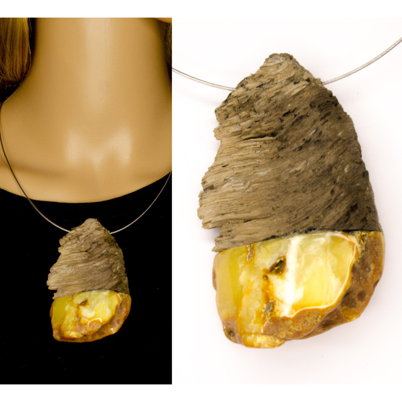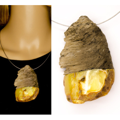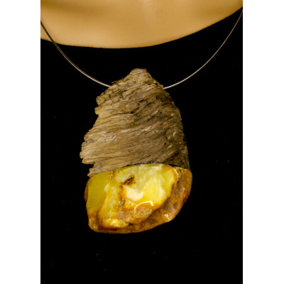 Handgemachter Anhänger aus baltischem Bernstein in Fassung aus Treibholz. Der Stein ist naturbelassen. Der Halsreif ist in das Collier integriert.