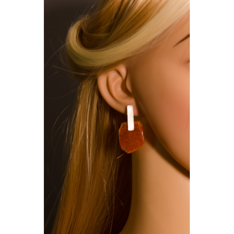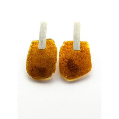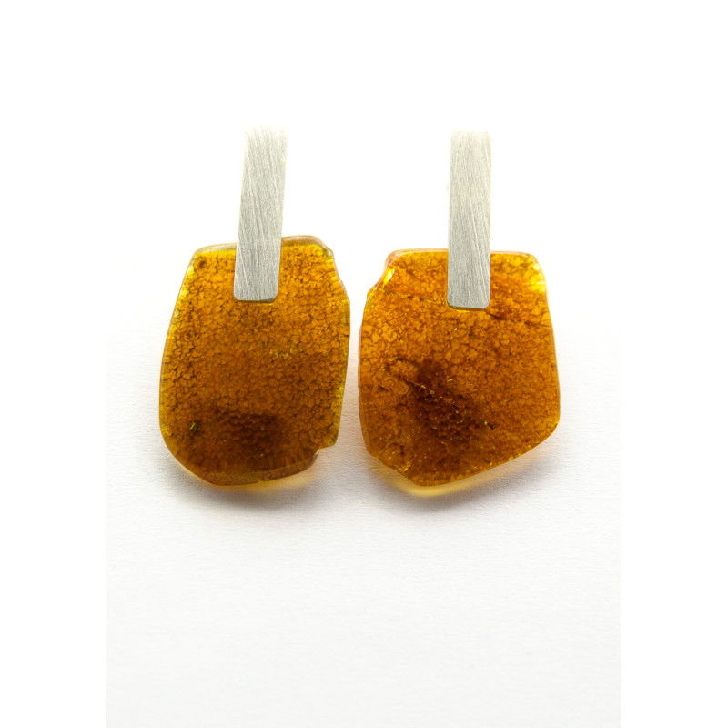 Handgemachte Ohrringe aus einem Brocken des baltischen Bernsteins auf Silberbrisuren, Silber 925. Der Stein ist poliert.