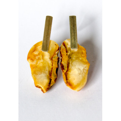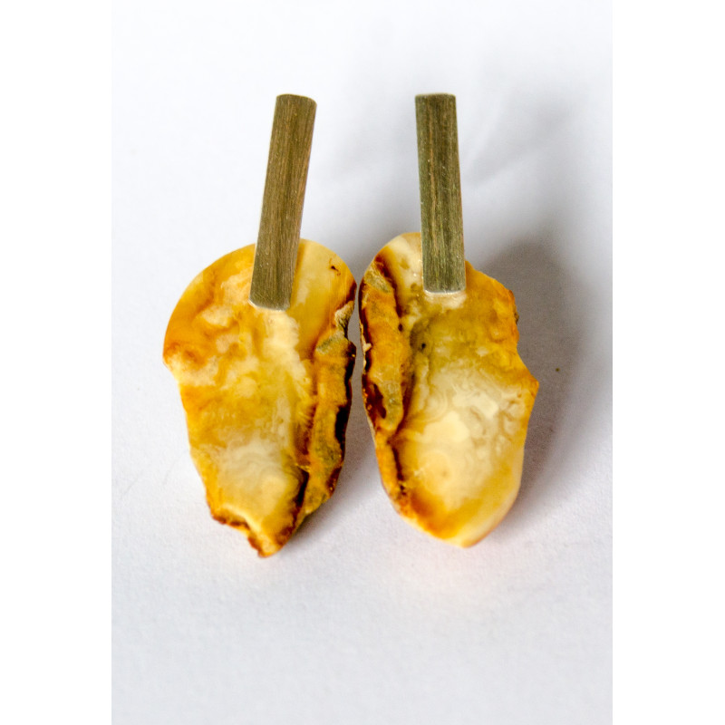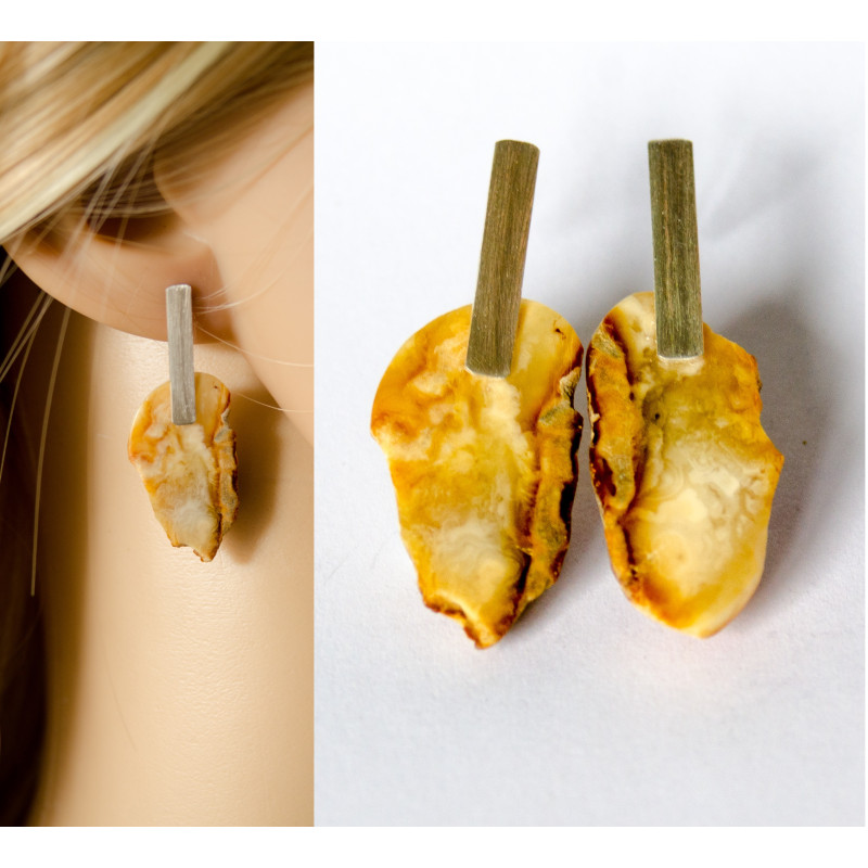 Handgemachte Ohrringe aus einem Brocken des baltischen Bernsteins auf Silberbrisuren, Silber 925. Der Stein ist poliert.
