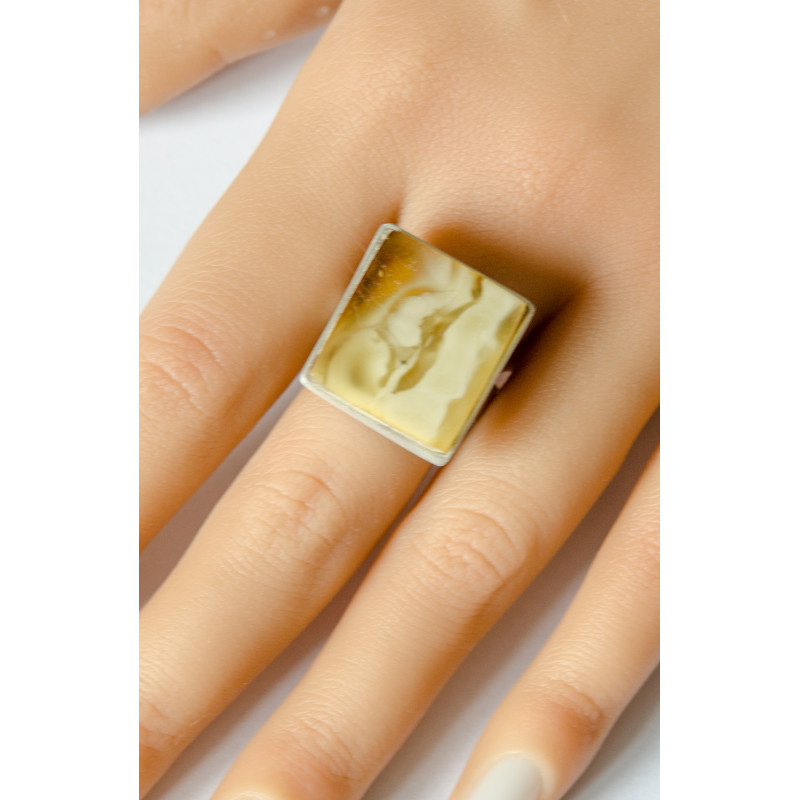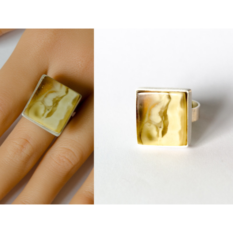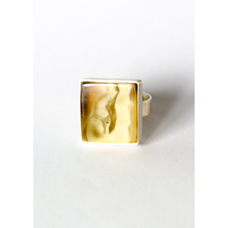 Handgemachter Ring aus einem Brocken des baltischen Bernsteins in quadratischer Form, auf matter, runder Ringschiene aus Silber 925. Der Stein ist poliert.