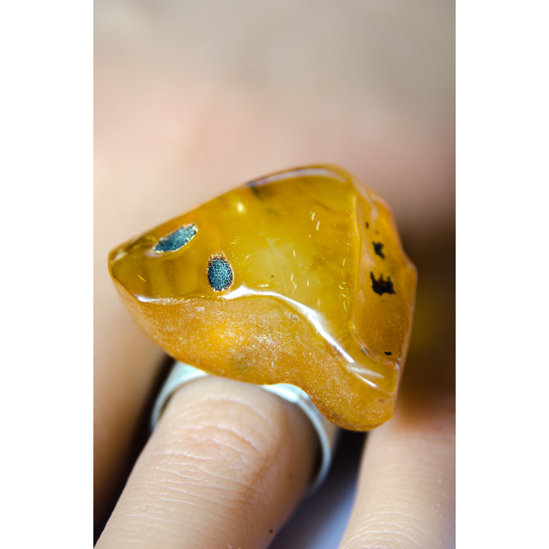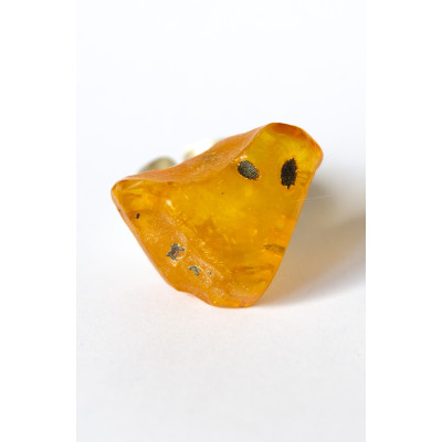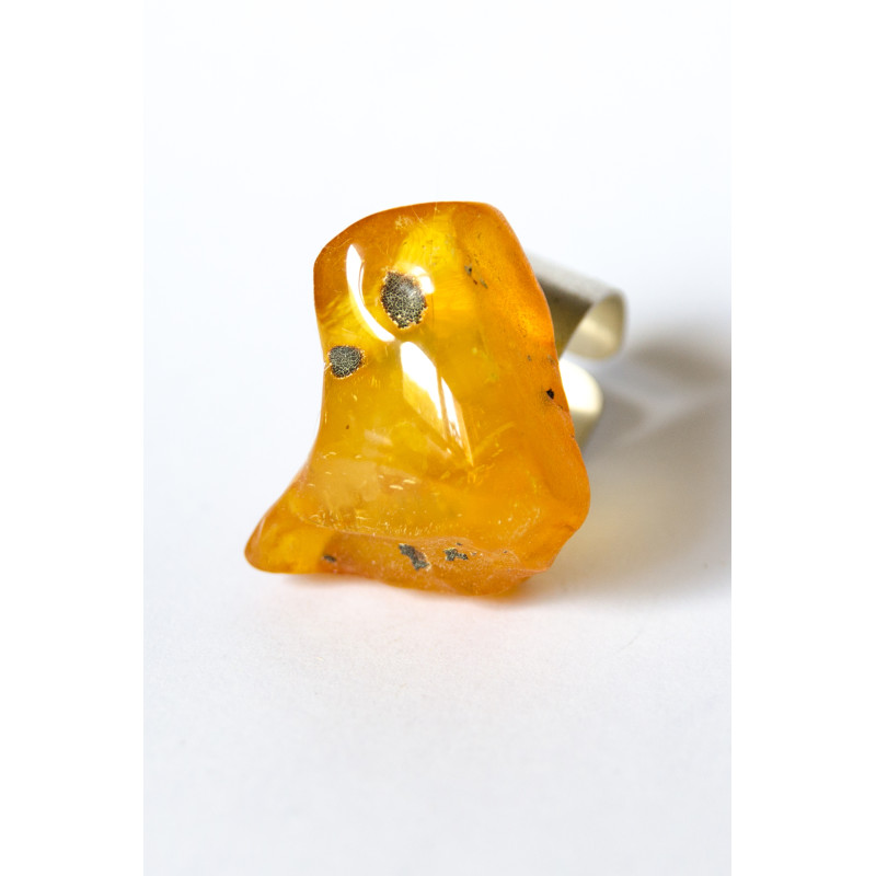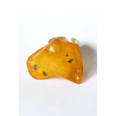 Handgemachter Ring aus einem Brocken des baltischen Bernsteins auf matter, runder, breiter Ringschiene aus Silber 925. Der Stein ist poliert, seitlich naturbelassen.