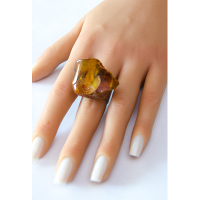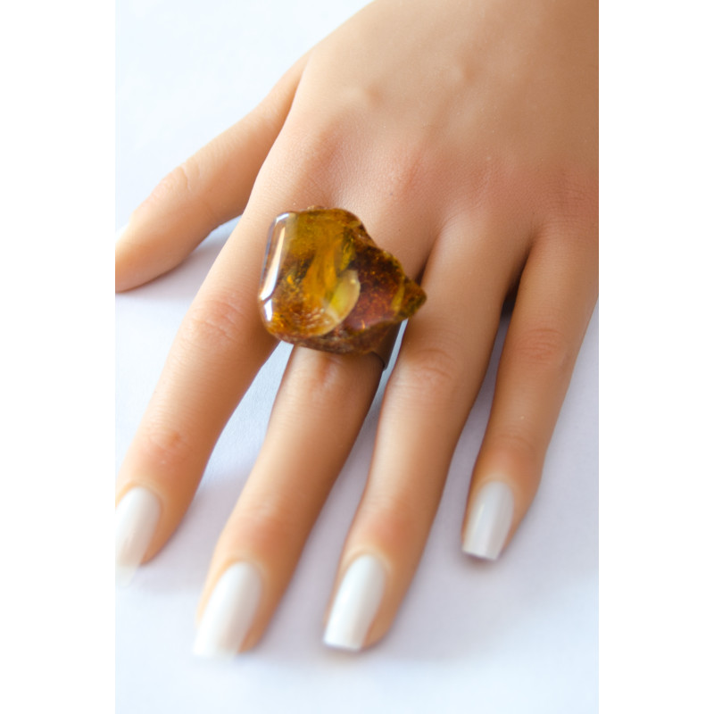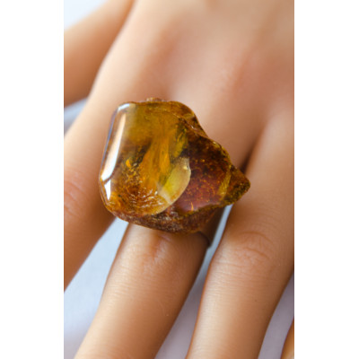 Handgemachter Ring aus baltischem Bernstein mit Silber 925 verbunden. Der in Form unregelmäßige Stein ist vorne teilweise poliert, hinten naturbelassen.
