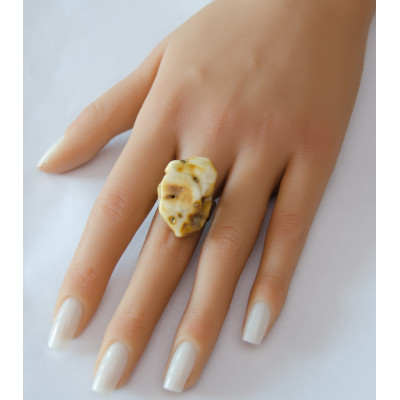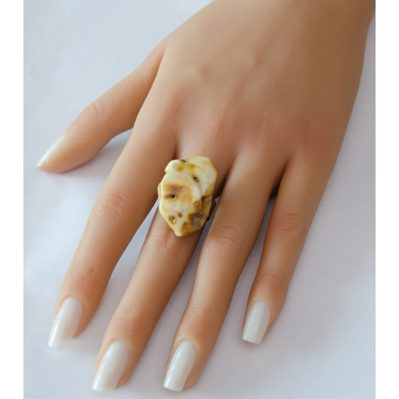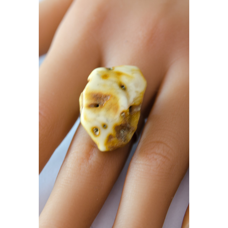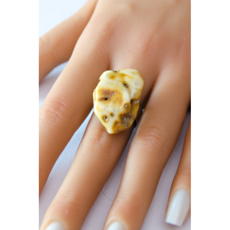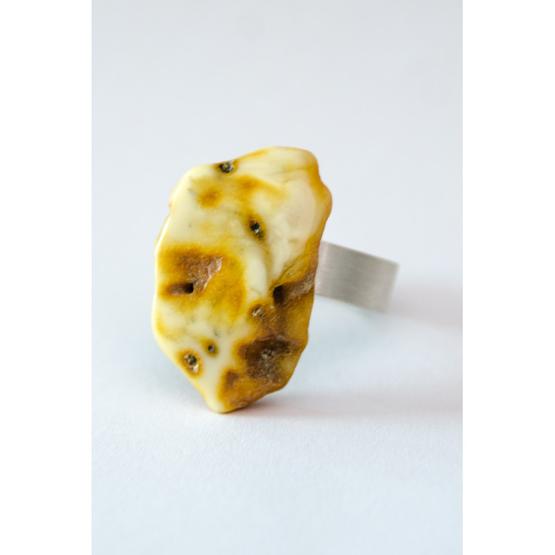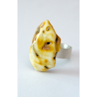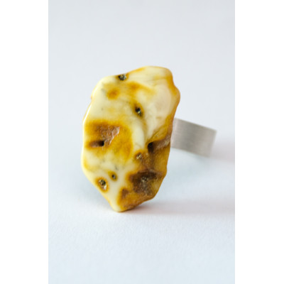 Handgemachter Ring aus einem Brocken des baltischen Bernsteins auf matter, runder Ringschiene aus Silber 925. Der Stein ist poliert, seitlich naturbelassen.