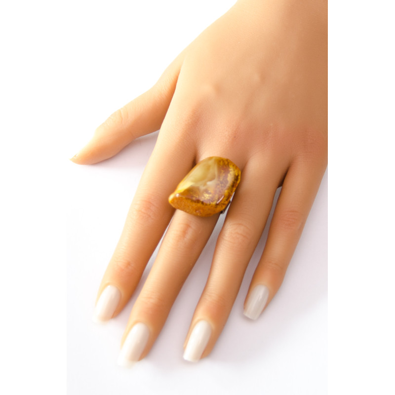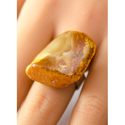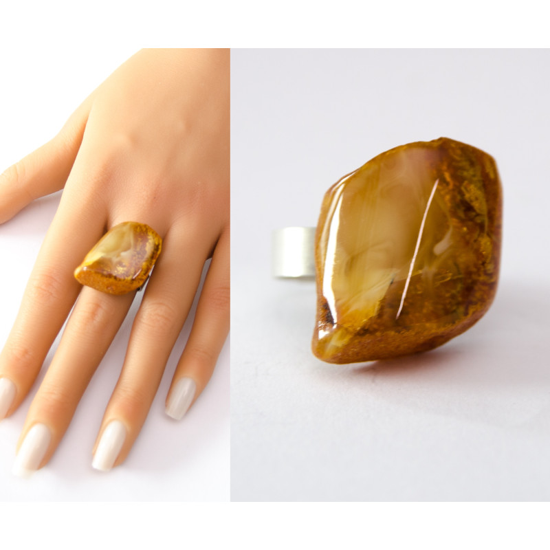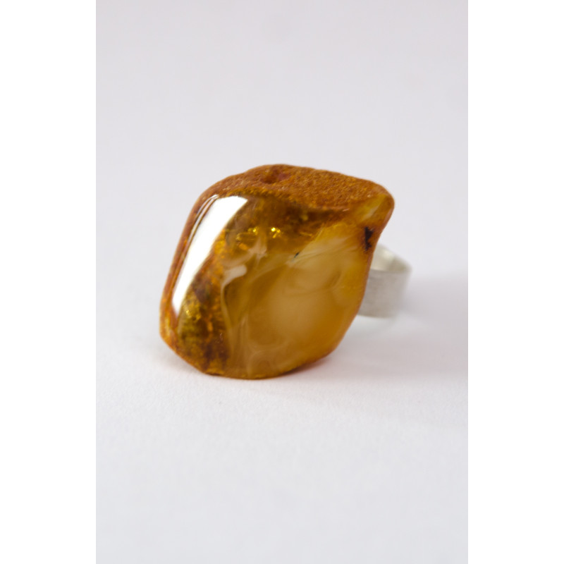 Handgemachter Ring aus einem Brocken des baltischen Bernsteins auf matter, runder Ringschiene aus Silber 925. Der Stein ist poliert, seitlich naturbelassen.